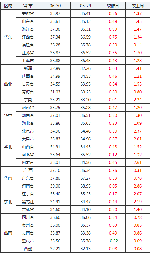2020年06月30日全國外三元生豬價格行情漲跌表